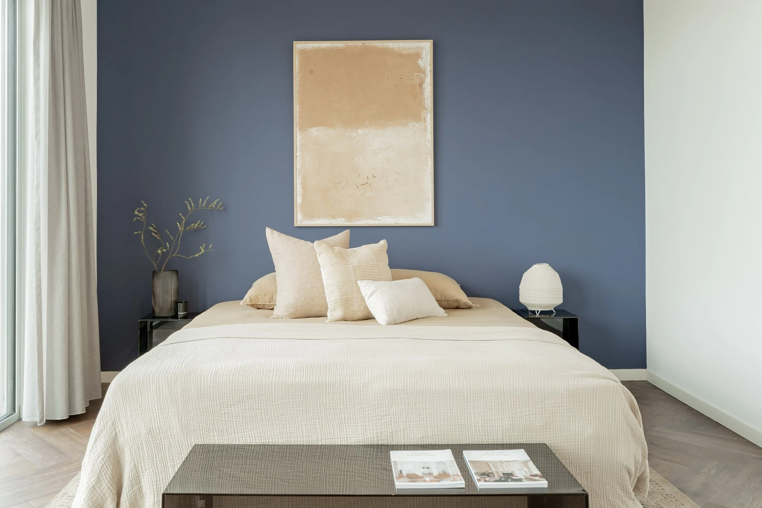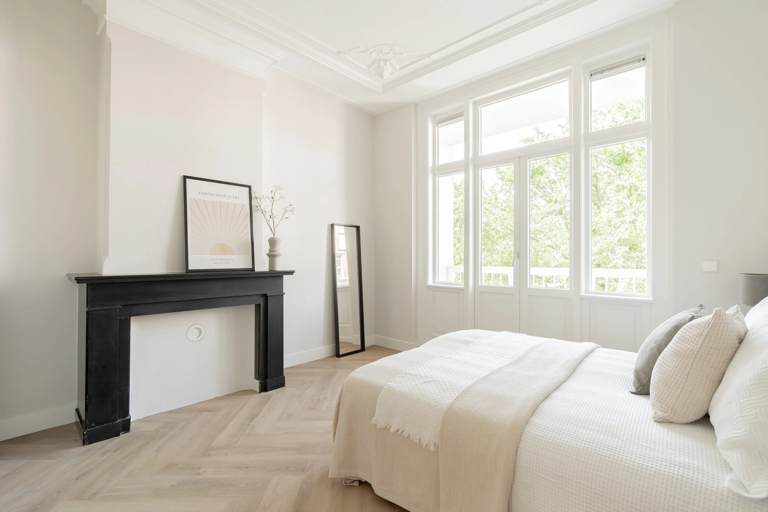 Het doel is om je slaapkamer te transformeren tot een rustgevende en comfortabele ruimte. Gebruik een neutraal kleurenpalet voor de muren en beddengoed om een rustgevende en ontspannende sfeer te creëren. Zorg ervoor dat het bed netjes is opgemaakt met schoon en gecoördineerd beddengoed. Voeg wat sierkussens toe voor een luxueuze uitstraling. Haal overtollige persoonlijke spullen weg, maar voeg een paar smaakvolle accenten toe, zoals decoratieve kaarsen of een kunstwerk, om karakter toe te voegen. Zorg ervoor dat de kledingkast keurig en georganiseerd is. Sorteer kleding op kleur, berg kleinere items op in lades en verwijder indien nodig kledingstukken en items die te veel aandacht trekken.